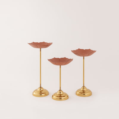 Straight-designed diyas with no more sophistication promising the eminating quality wherever it is placed. These diyas are made of iron with gold polish and a terracotta holding palm to light the area. The overall finish is simple, but the terracotta leaf that holds oil and the flicker makes room for more than a couple of flickers that give ambiance when lit in the living room. Arrange these on the shelves of the main rack or through the small mantle furniture on the living room wall. A simple point and presentation to make the evening a Diwali evening.