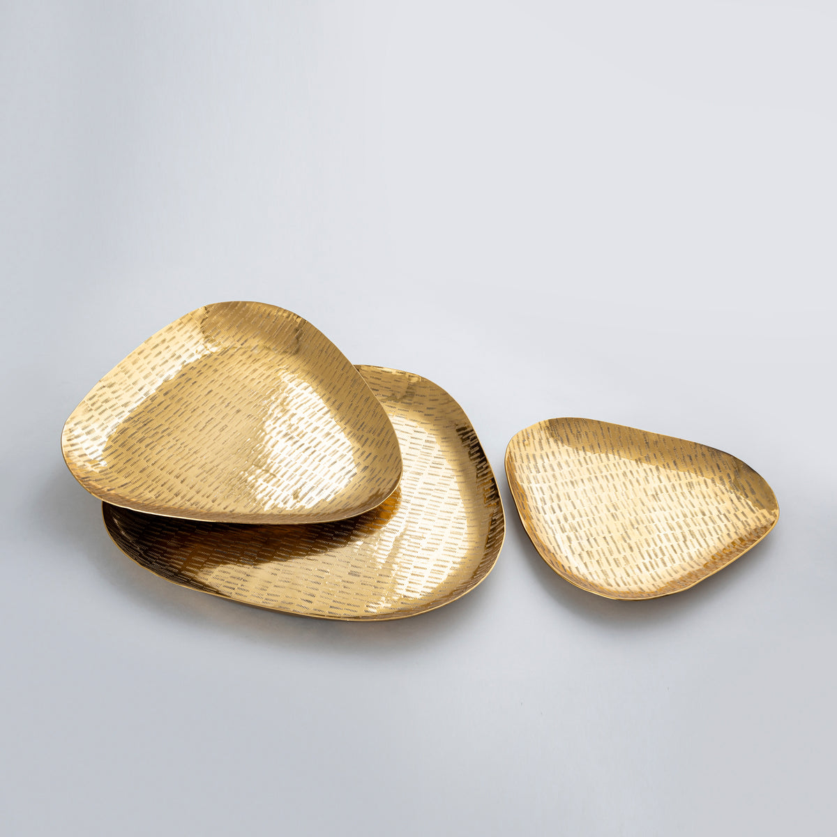 Introducing our Gold Triangle Tray Set of 3, a stunning addition to your home decor collection. Crafted with meticulous attention to detail, each tray features a sleek triangular design and a luxurious gold finish that exudes sophistication and elegance. Perfect for organizing small items, serving appetizers, or displaying decorative accents, this versatile set adds a touch of glamour to any space. Whether used together to create a cohesive look or individually to add flair to different areas of your home, these trays are sure to elevate your interior decor. Made from high-quality materials, they are durable and built to last, ensuring long-lasting enjoyment and functionality. Enhance your home decor with the exquisite beauty of our Gold Triangle Tray Set of 3, where style meets versatility in perfect harmony.