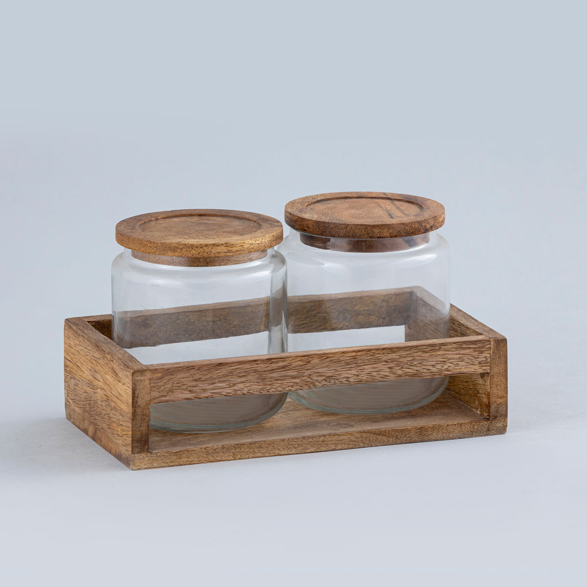The perfect harmony of rustic charm and modern elegance with our Wood & Glass Canister Set. Crafted with meticulous attention to detail, this set combines the natural warmth of wood with the sleek transparency of glass. Each canister is thoughtfully designed to showcase the beauty of its contents while providing a practical storage solution for your kitchen essentials. Whether it's storing dry ingredients like flour and sugar or organizing small trinkets and accessories, these canisters offer versatility and style. The wooden lids add a touch of organic texture, while the clear glass bodies allow for easy identification of contents. Elevate your kitchen decor with the timeless appeal of our Wood & Glass Canister Set, where functionality meets aesthetics in perfect harmony.