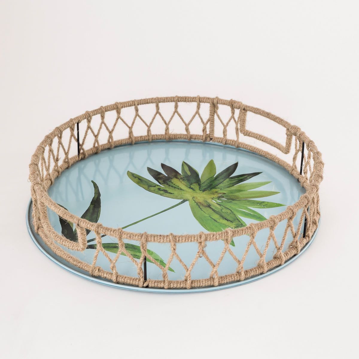 our Leaf-Printed Round Tray, meticulously crafted from durable iron and coated with a sleek powder finish. This exquisite tray seamlessly blends functionality with elegance, offering a stylish solution for serving and organizing in any culinary space. The intricate leaf pattern adds a touch of natural charm, while the sturdy construction ensures long-lasting durability. Whether used to serve appetizers at gatherings or to display decorative accents on countertops, this versatile tray enhances the aesthetic appeal of any room. Its round design and ample size make it perfect for serving drinks, snacks, or desserts with effortless style. Elevate your hosting experience and add a dash of sophistication to your home decor with our Leaf-Printed Round Tray.
