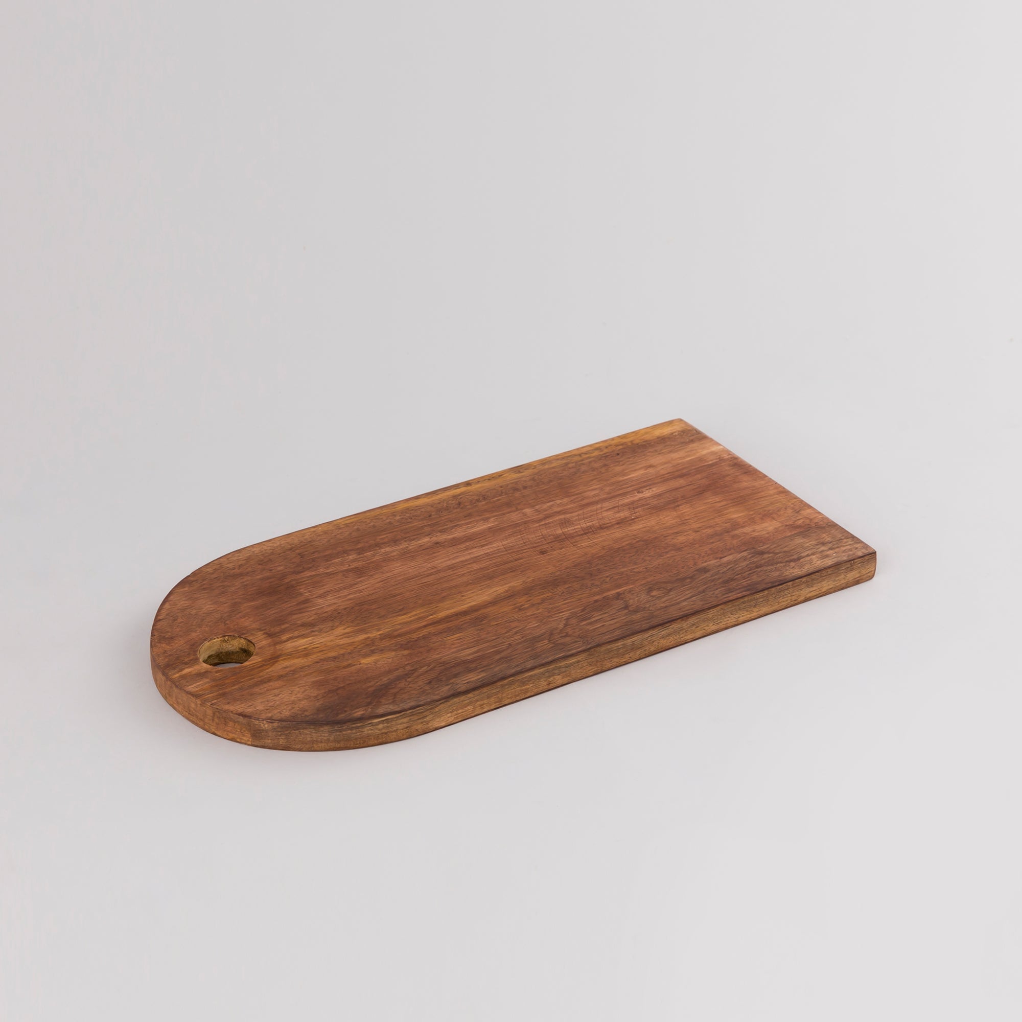 This semi board-shaped mango wood board can be used to chop, cut, and serve purposes. The sturdy natural brown wooden base easily handles knife marks and keeps your kitchen surface safe. Hang it by inserting the rope at the top centre. Clean and wipe with a damp cloth only.