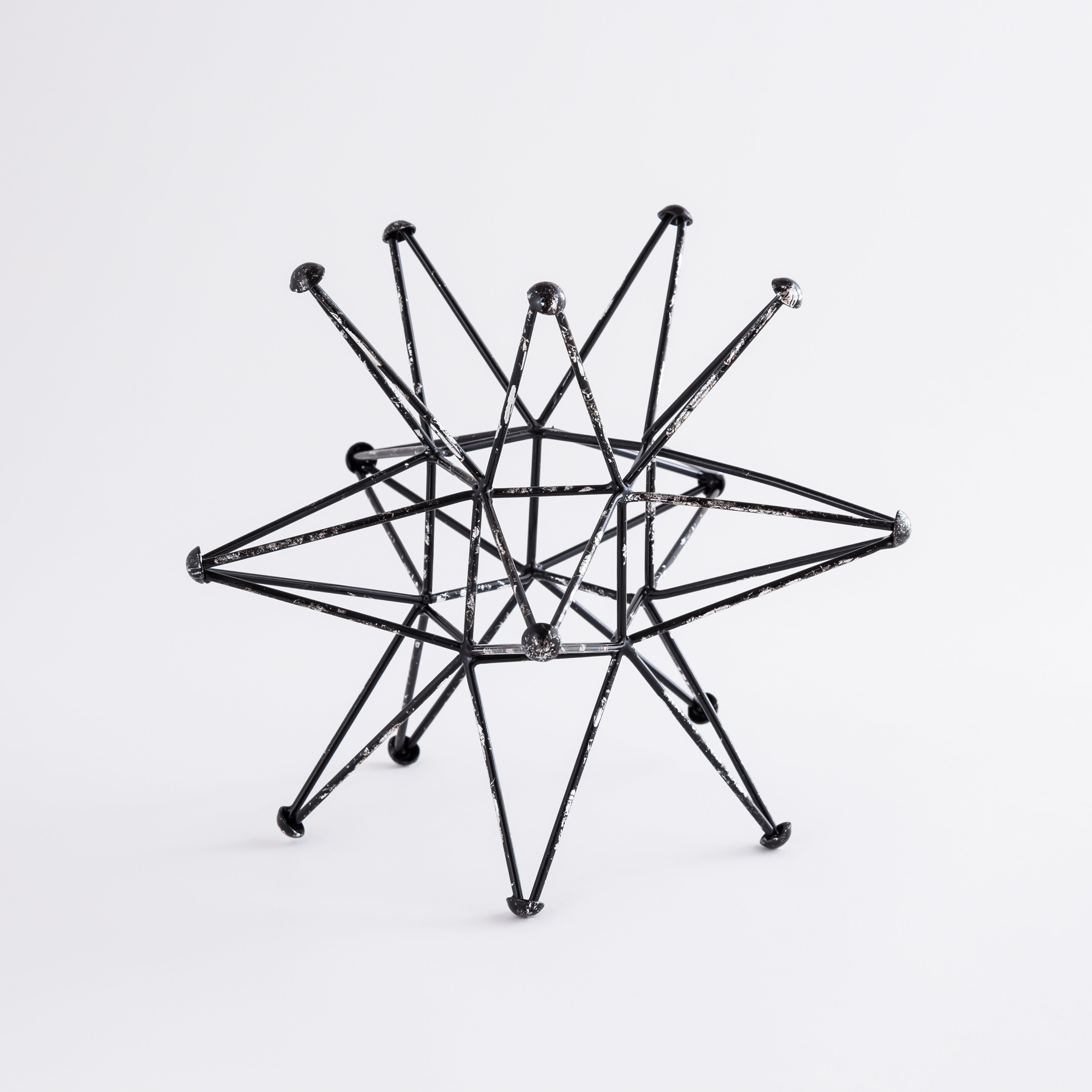 Modern star-shaped iron decorative stand with black and silver finish serves as a stylish décor element for your table or any countertop. Place it alone or with other decorative items to create a unique style statement. Clean using a dry or damp cloth only.