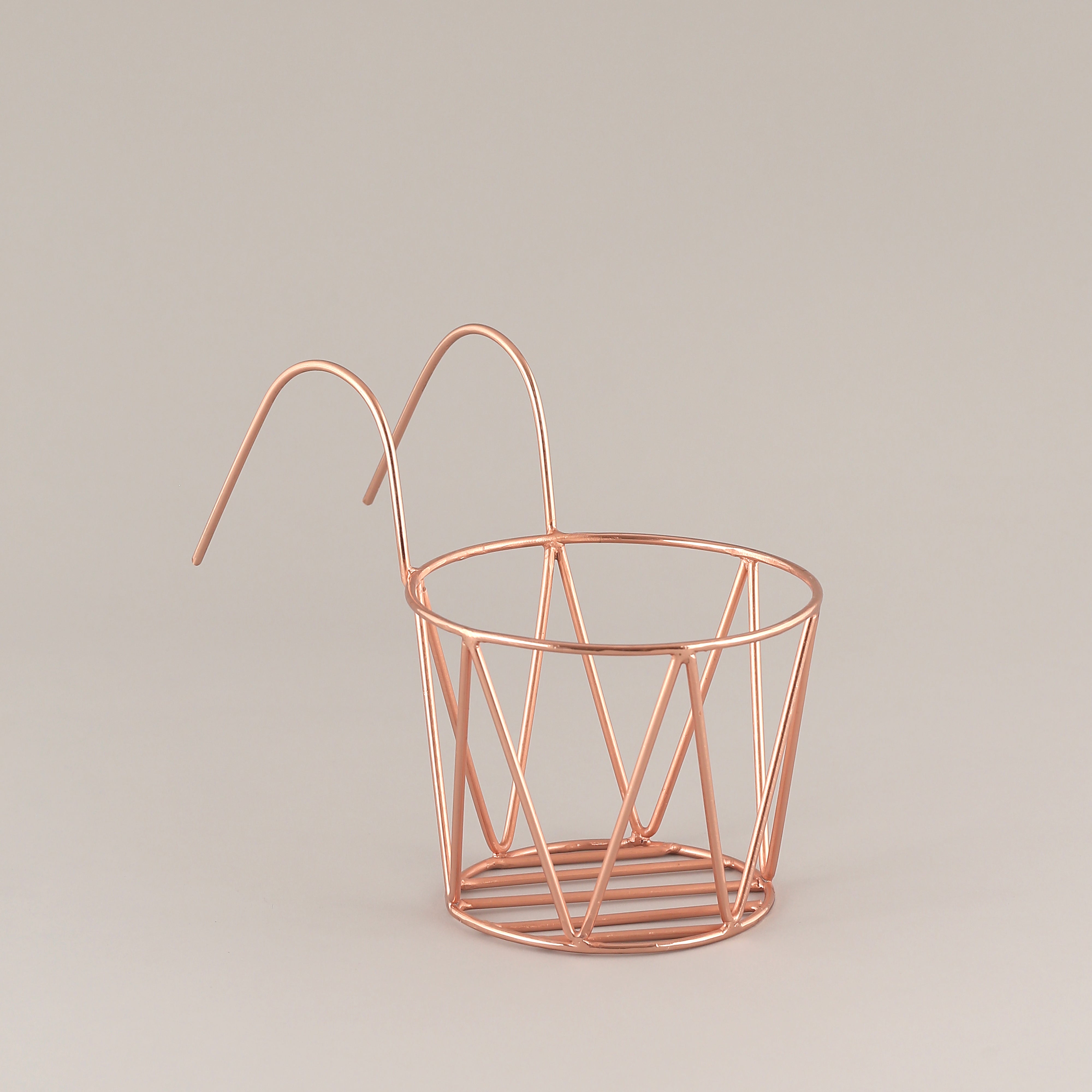 This elegant hanging pot holder provides a sophisticated look to your home or office balcony. The steel base with a brass finish with two hooks is easy to mount and can be paired with flowers and small plants. Direct planting is not recommended. Use a liner or a plastic pot.