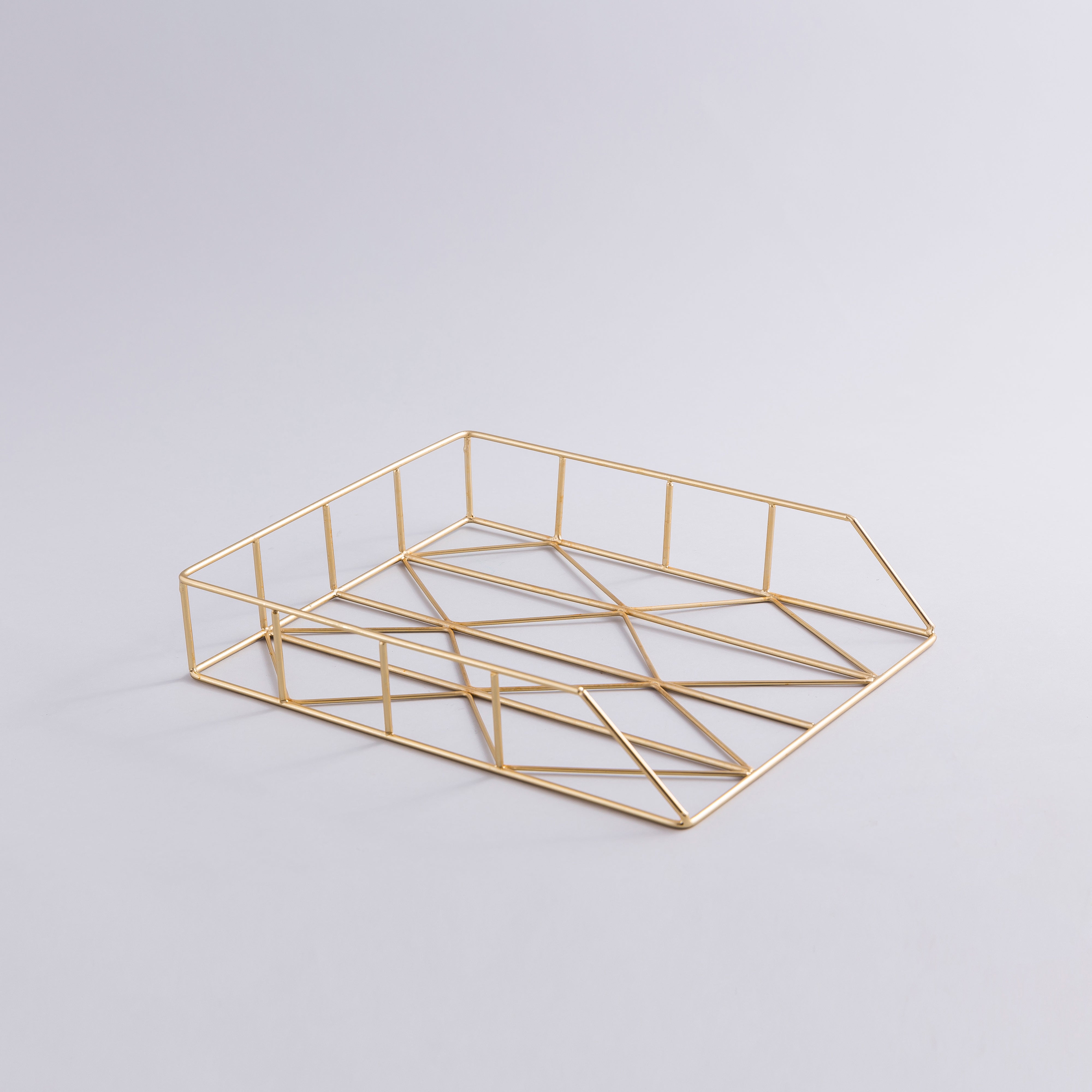 This stylish side-loading brass-plated iron table organizer keeps your tabletop organized. You can store magazines, bills, and other sleek items. The see-through wireframe design makes it easy to visualize the stored stuff. Clean with a dry or damp cloth.